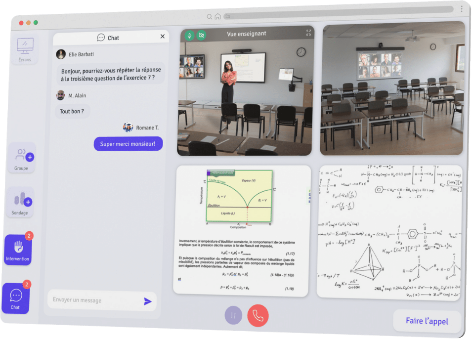 - L’interactivité intégrée : Les outils (quizz, « passage au tableau », travail de groupe) sont intégrés à la console de l’enseignant et au lecteur de l’étudiant, assurant une expérience fluide sans changer de logiciel.